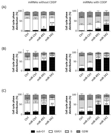 Figure 3B,C). MiR-491-5p and miR-342-5p alone did not induce a cell cycle blockade (no stalling in S or G2/M phases), but they increased the percentage of cells in the sub-G1 phase, an indicator of the induction of cell death.