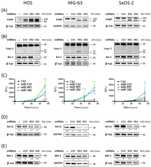 2.4. MiR-342-5p and MiR-491-5p Activate the Apoptosis Pathway in Osteosarcoma Cells