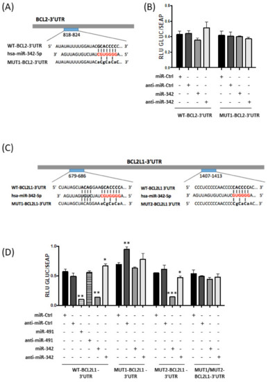 Wild-type (WT) and mutant (MUT) vectors of BCL2-3′UTR (217HmiT016211a-MT05) and BCL2L1-3′UTR (217HmiT108616-MT05) containing Targetscan predictive or mutated miR-342-5p and miR-491-5p binding sites were purchased from GeneCopoeia (Rockville, MD, USA) and used as previously described [