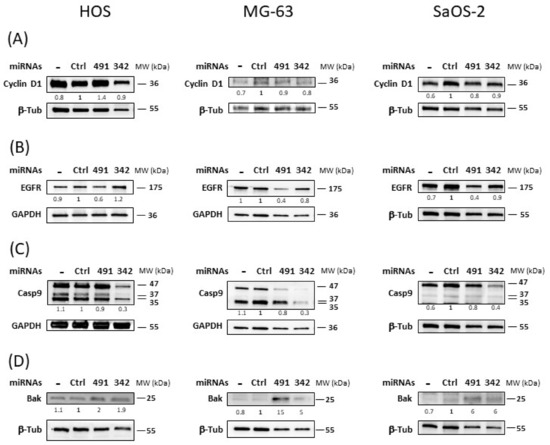 MiR-342-5p decreased Bcl-2 protein expression (from 1.4 to 2-fold) in the three osteosarcoma cell lines. Although we validated