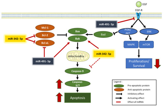 17], we also demonstrated that miR-491-5p inhibits the expression of Epidermal Growth Factor Receptor (EGFR), whose spontaneous activation in the absence of ligand is associated with tumor progression. Additionally, miR-491-5p also increases the expression of the Bak pro-apoptotic protein. Despite obvious pro-apoptotic effects, we also showed that miR-342-5p had anti-apoptotic potential because it leads to a decrease in pro-caspase-9 protein expression in chondrosarcoma cells [