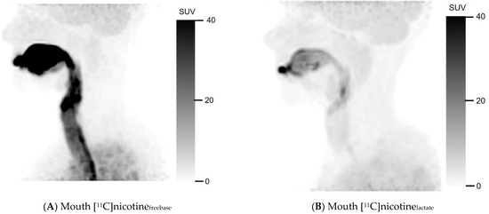 The two formulations used in the present study had an identical chemical composition apart from the charged state of nicotine, rendering the pH values to be 3.98 for the lactate formulation and 9.98 for the freebase formulation (see Section 4.2). The pH of the formulated [11C]nicotine solutions varied between 6–8; this is most likely due to a low buffering capacity of the added reference formulations. A regional difference in distribution and deposition was still observable for the two [11C]nicotine formulations as the data presented in the current study showed [11C]nicotine in the freebase formulation deposited in the mouth and upper respiratory tract and [11C]nicotine in the nicotine lactate formulation deposited in the alveoli. This result is in line with the hypothesis that freebase nicotine is indeed more volatile and thus more likely to off-gas from the aerosol droplets than the less volatile nicotine salt resulting in a different nicotine deposition profile [18,19,27]. Moreover, this proof-of-concept study demonstrates that the administration of [11C]nicotine via e-cigarette aerosols is sufficient for the evaluation of nicotine distribution to the lungs, circulating blood, and brain.
