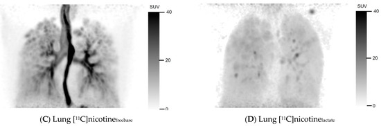 For the nicotine lactate formulation, a deposition of [11C]nicotinelactate can be observed in the oral cavity after inhalation (Figure 1B) but noticeably less in the trachea compared to the freebase formulation. The lower trachea, the bronchial tree, and the oesophagus were hard to discriminate in the nicotine lactate images of the lung (Figure 1D) but some hotspots were identifiable in the bronchial tree. However, the uptake in the lung parenchyma was higher and more homogenous with [11C]nicotinelactate compared to [11C]nicotinefreebase. Even in this case, the [11C]nicotinelactate uptake in the lungs differed notably from the surrounding thorax.