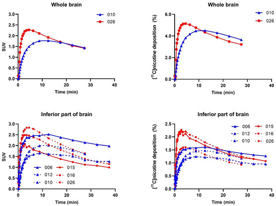 For the [11C]nicotinefreebase scan, the whole-brain TAC peaked with an SUV of 1.77 at 12.5 min and the highest deposition of 4.50% at 12.5 min after inhalation. The [11C]nicotinelactate TAC revealed a peak SUV of 2.27 and the highest deposition of 5.14% at 270 s after inhalation.