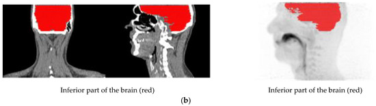 (a) Illustration of the delineated VOIs on mouth and lung scan. (b) Illustration of the delineated VOIs on inferior part of the brain.