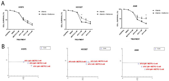 (A) Cytotoxic effect of afatinib alone or in combination with metformin in H1975, HCC827, and A549 NSCLC cell lines. Cells were seeded and treated with the previously described schemes for 72 h and MTT assays were performed. Points represent the mean of 3 independent experiments by triplicate. Statistical analysis was performed through two-way ANOVA. ** p ≤ 0.01. (B) Combination index plots from NSCLC cell lines. Plots show the different afatinib concentrations for each cell line, in combination with metformin. We observed that the H1975 cell line had synergism with the two highest concentrations of afatinib (2 and 3 µM), the HCC827 cell line had a degree of synergy with the lowest afatinib concentration (3 nM), while a synergic effect in the three combined treatments of the A549 cell line was observed.