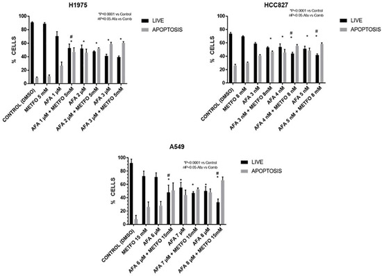 Apoptosis induction of afatinib plus metformin treatment in H1975, HCC827, and A549 cell lines. We observed similarities between the apoptosis test and cytotoxicity induction results. In total, 5000 events were analyzed in each assay. Cells were seeded and treated with the previously described scheme for 72 h and then analyzed with the apoptosis kit and flow cytometry. Bars represent the means of 3 independent experiments by triplicate. Statistical references are presented in each graph. * p < 0.0001 vs control, # p < Afa vs. Combo.