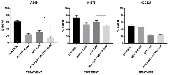 Membrane EGFR expression by metformin–afatinib. Cells were seeded and treated with respective schemes for 72 h, then, 5000 events were analyzed by flow cytometry with an EGFR-specific antibody. Bars represent the means of 3 independent experiments by triplicate. Statistical analysis was performed through one-way ANOVA. * p ≤ 0.05.