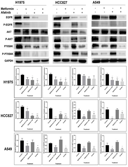 Effect of combination therapy metformin–afatinib on the EGFR signaling pathway. Cells were seeded and treated for 72 h with their respective metformin–afatinib concentrations. GAPDH was used as constitutive control, Western blot images were analyzed by image (NIH) and represented as bars. Images are representative of three independent experiments and results of area are presented as mean ± SD. Data were normalized regarding endogenous control and statistically analyzed by one-way ANOVA. * p ≤ 0.05, ** p ≤ 0.01, *** p ≤ 0.001, **** p ≤ 0.0001.
