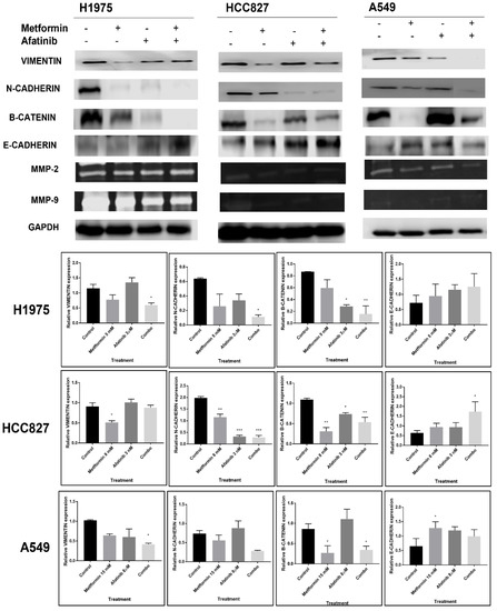 Reduction in levels of EMT and reestablishment of epithelial markers has been proposed as one of the regulated mechanisms by the use of metformin and its combination with first generation TKIs. Nevertheless, information regarding EMT phenotype downregulation in metformin treatments involving afatinib (second generation TKI) was still lacking; hence, we analyzed the expression of multiple EMT-related molecules to compare these results with those obtained by first generation TKIs. In this sense, we found a decrease in N-cadherin, vimentin, β-catenin, MMP-2, and MMP-9 levels by use of metformin alone or in combination with afatinib, along with an important increase in E-cadherin in response to all treatments, and mainly to this combination. According to each cell line, afatinib inhibited N-cadherin and β-catenin on H1975 cells, and only N-cadherin in HCC827 cells. These effects were not reachable for first generation TKI in previous studies, possibly due to unstable EGFR pathway inhibition and TKI resistance through activation of the IL-6R/JAK1/STAT3 axis [21,38,39,40]. In agreement, a significant reduction in EMT markers has been reported in TKI-resistant LC cell lines treated with the combination of metformin plus gefitinib [21,40].