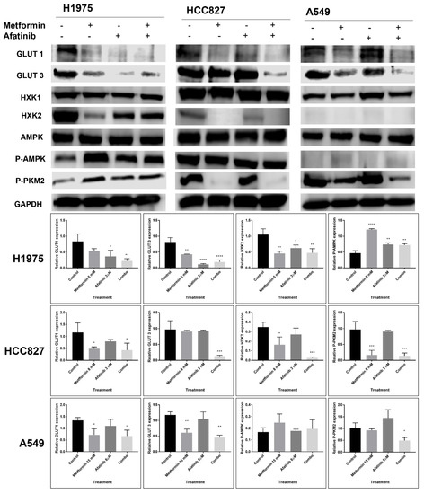 Effect of metformin–afatinib combined treatment on glycolytic enzymes and proteins. Cells were seeded and treated for 72 h with their respective metformin–afatinib concentrations. GAPDH was used as constitutive control, Western blot images were analyzed by image (NIH) and represented as bars. Images are representative of three independent experiments and results of area are presented as mean ± SD. Data were normalized regarding endogenous control and statistically analyzed by one-way ANOVA. * p ≤ 0.05, ** p ≤ 0.01, *** p ≤ 0.001, **** p ≤ 0.0001.