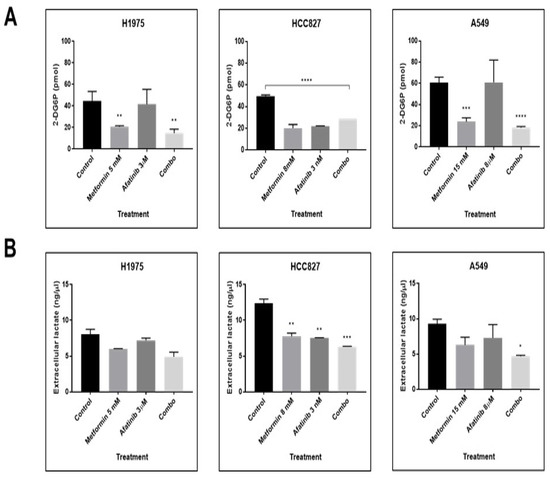 In addition, we explored the impact of metformin–afatinib treatment on glucose uptake by measuring cellular incorporation of 2DG6P and lactate secretion through its measurement in cell culture medium. LC cells H1975 had a reduction of 33.4 pmol with combined treatment compared with controls (p = 0.0009). LC cells A549 exhibited a decrease of 42.6 pmol for 2DG6P uptake with combination vs. control (p = <0.0001). Finally, LC cells HCC827 showed glucose uptake inhibition in a range of 20.9–29.9 pmol when treated with metformin alone and with the combined scheme, compared with control (p = <0.0001) (Figure 7A).