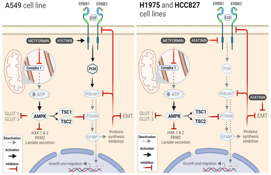 Mechanism of action of combined treatment afatinib–metformin. In the EGFR mutant LC cell lines (H1975 and HCC827), afatinib exerts its basal inhibitory effects over the EGFR pathway, decreasing both processes, glycolysis, and EMT transition. Furthermore, this inhibition can be exacerbated with the complementary effect of metformin through AMPK stimulation and subsequent P70S6K inhibition coupled with a decrease in protein synthesis. On the other hand, the A549 cell line (EGFR wild-type) showed stimulation of the EGFR pathway associated with afatinib treatment as a single drug, however, with complementary metformin treatment, the combination can counteract the pathway activation caused by afatinib, decreasing protein synthesis, glycolytic phenotype, and EMT; also, our results suggest a sensitization of this cell line to afatinib treatment when metformin is added, acting synergistically in cytotoxic induction.