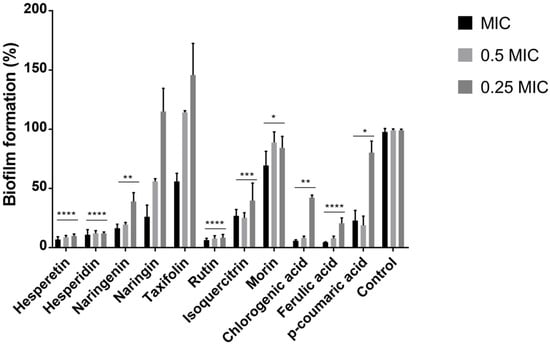 Formation of P. aeruginosa IBRS P001 biofilm after treatment with polyphenols. The error bars indicate standard deviations. The asterisks represent statistical significance *, p ≤ 0.05; **, p ≤ 0.01; ***, p ≤ 0.001, ****, p ≤ 0.0001, the data are presented as mean ± SD.