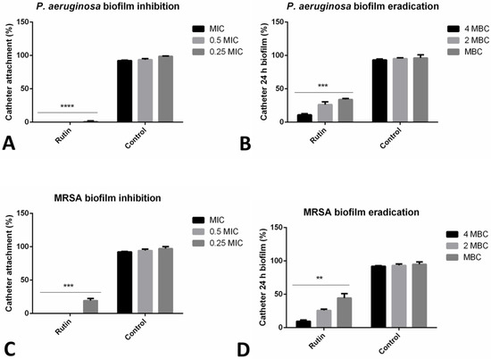The inhibitory effect of rutin on the biofilms in the model of urinary catheter biofilm was examined. Incubation with rutin, even in the sub-MIC concentration has significantly reduced (***, p ≤ 0.001, ****, p ≤ 0.0001) the biofilm forming abilities of two strains examined (MRSA IBRS MRSA 011 and P. aeruginosa IBRS P001) (Figure 2). The number of P. aeruginosa IBRS P001 colonies attached to the urinary catheters after the treatment with MIC and 0.5 MIC of rutin was 0, indicating 100% biofilm inhibition as determined using this model.