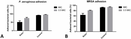P. aeruginosa IBRS P001 (A) and MRSA IBRS MRSA011 (B) adhesion to HaCaT cells upon treatments with rutin (%). The data are presented as mean ± SD.