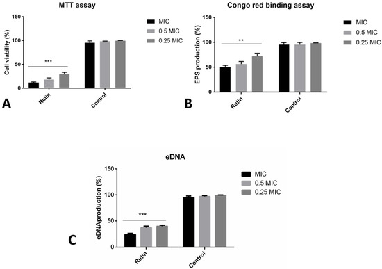 Co-incubation with rutin has led to the significant reduction of the formed biofilm biomass, as recorded in the previous crystal violet biofilm assay (Figure 1). We have additionally observed different rutin modes of P. aeruginosa IBRS P001 biofilm prevention abilities (Figure 4). The metabolic activity of cells forming the biofilm was reduced by 88% when bacteria were co-incubated with rutin MIC (Figure 4A). The level of biofilm exopolysaccharides was also significantly (**, p ≤ 0.01) affected with the application of rutin, as determined in the Congo red binding assay (Figure 4B). Rutin at MIC, 0.5 MIC and 0.25 MIC reduced the levels of the produced exopolysaccharides to 50%, 56% and 72% of production, respectively, compared to the vehicle treated control. Likewise, rutin’s co-incubation has induced a significant (***, p ≤ 0.001) reduction in the amounts of eDNA within the bacterial biofilm. Even the lowest examined concentration (0.25 MIC, 0.125 mg/mL) induced more than a 50% inhibition of eDNA levels (Figure 4C).