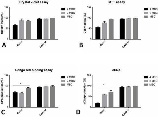 Rutin treatment induced lower amounts of exopolysaccharide production within the biofilm, as determined in the Congo red binding assay (Figure 5C). Exopolysaccharide production decreased to 69%, 65%, and 89% after the application of rutin 4 MBC, 2 MBC, and MBC, respectively. Levels of eDNA in the biofilm matrix were significantly reduced upon rutin treatment (Figure 5D).