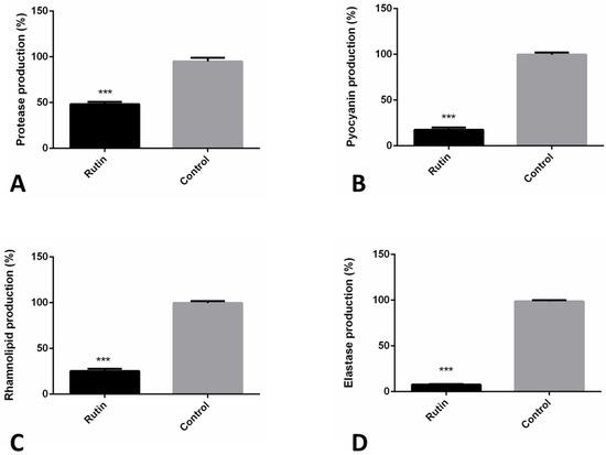 Rutin (0.5 MIC, 0.250 mg/mL) antivirulence mechanisms towards P. aeruginosa IBRS P001: impact on protease (A); pyocyanin (B); rhamnolipid (C) and elastase (D) production. The asterisks represent statistical significance ***, p ≤ 0.001; the data are presented as mean ± SD.