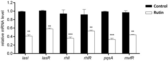 RT-qPCR was performed in order to confirm the above described effects of rutin on P. aeruginosa IBRS P001 virulence (Figure 7). The selected P. aeruginosa genes belong to three QS networks las, rhl, and pqs: las-lasI, lasR; rhl-rhlI, rhlR; pqs-pqsA, mvfR. The acquired results revealed that the treatment of P. aeruginosa IBRS P001 with rutin (0.5 MIC, 0.25 mg/mL) significantly decreased the relative mRNA levels of analyzed QS genes (**, p ≤ 0.01; ***, p ≤ 0.001). The most significant downregulation was observed for the autoinducer synthases rhlI and pqsA (2.6 and 3-fold lower, respectively; ***, p ≤ 0.001) when compared to the untreated control. The relative expression of the other four analyzed genes was decreased: 2.4 times for lasI, 2.2 times for mvfR and about 1.7 times for lasR and rhlR.