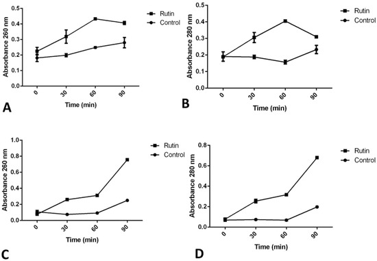 Treatment with rutin has obstructed P. aeruginosa IBRS P001 cell membrane integrity, as indicated with the increase in absorbance of both released nucleic acids (Figure 8A) and proteins (Figure 8B) after 60 min. Membrane integrity of MRSA IBRS MRSA 011 was also disrupted, but in this case a more significant increase in the absorbance was observed after 90 min treatment, as indicated by the absorbance at 260 nm (Figure 8C) and 280 nm (Figure 8D).