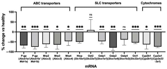 Changes in transporter and cytochrome mRNA expression in the liver of LPS-treated rats (24 h after exposure to LPS) compared to healthy rats estimated by qPCR (n = 4 both in healthy and LPS-treated groups). Data are mean ± SD. * p ≤ 0.05, ** p ≤ 0.01, *** p ≤ 0.001, ns indicates not significant, one-sample t-test after a Shapiro–Wilk Normality test. Cyp: cytochrome; LPS: lipopolysaccharide; Mdr: multidrug resistance; Mrp: multidrug-resistance associated protein; Ntcp: Na+-taurocholate cotransporting polypeptide; Oat: organic anion transporter; Oatp: organic anion-transporting polypeptide; Oct: organic cation transporter.