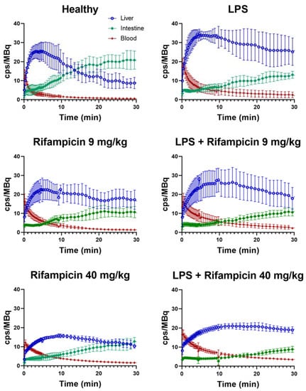 Mean (±SD) time–activity curves of 99mTc-mebrofenin in the liver (○), intestine (◆), and blood (+) of healthy and LPS-treated rats (24 h after exposure to LPS) under baseline conditions and after treatment with 9 or 40 mg/kg rifampicin (n = 5 for control animals and n = 6 for LPS-treated animals). Radioactivity is expressed as counts per second (cps) normalized to the injected dose (MBq). LPS: lipopolysaccharide. Data obtained in the healthy and Rifampicin 40 mg/kg groups have already been presented in a previous study [29].