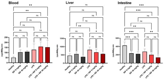 A pharmacological dose of rifampicin (9 mg/kg) significantly reduced the amount of 99mTc-mebrofenin in the intestines in healthy animals (p < 0.001), reaching similar levels as for the high dose rifampicin-treated animals. The pharmacological dose of rifampicin did not further decrease intestinal radioactivity in LPS-treated animals (p > 0.05). The pharmacological dose of rifampicin did not impact liver exposure in healthy or LPS-treated animals (p > 0.05). The pharmacological dose of rifampicin did not significantly exacerbate the impact of LPS on blood exposure (p > 0.05, Figure 4).