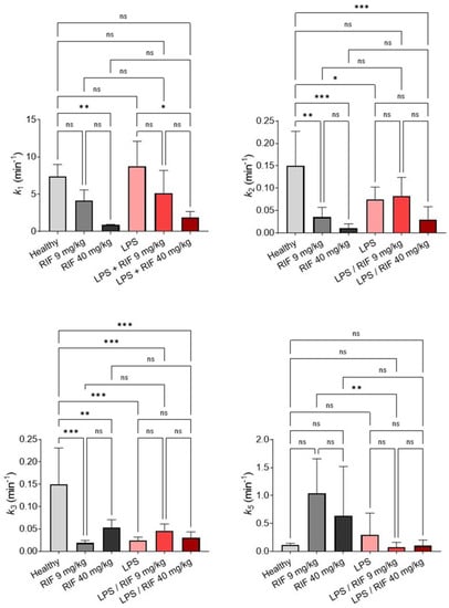 Pharmacokinetic model outcome parameters describing the hepatobiliary transport of 99mTc-mebrofenin in healthy and LPS-treated rats (24 h after exposure to LPS) under baseline conditions and after treatment with 9 or 40 mg/kg rifampicin (n = 5 for control animals and n = 6 for LPS-treated animals). Data are mean ± SD. * p ≤ 0.05, ** p ≤ 0.01, *** p ≤ 0.001, ns not significant, ordinary one-way ANOVA followed by a Tukey’s post hoc test for k2 and k3, and Kruskal–Wallis test for comparison of k1 and k3 data. LPS: lipopolysaccharide; RIF: rifampicin. The data of healthy and RIF 40 mg/kg groups have already been presented in a previous study [29].