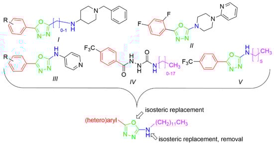 Structural fragments involved in the structure of targeted derivatives and their design: 1,3,4-oxadiazoles, long alkyl, aryl, and amine/amide linker.