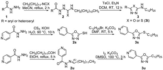 The synthetic scheme is illustrated in Figure 2. The synthesis of final oxadiazoles and their analogues 3a–3u started from aryl hydrazides that were either commercially available or prepared in-house from corresponding acid via Fisher esterification (with MeOH in the presence of a catalytic amount of sulfuric acid) and subsequent hydrazinolysis of the methyl ester. Then, hydrazide was reacted with a mild excess of dodecyl iso(thio)cyanate in acetonitrile. Crude 2-aryloylhydrazine-1-carboxamides 2 were purified by recrystallization with moderate to excellent yields of 67–98%. The lowest yields were for 2-bromopyridine derivative 2q, followed by 3,5-dinitrobenzohydrazide derivative 2k and thioamide 2t (for both 76%).