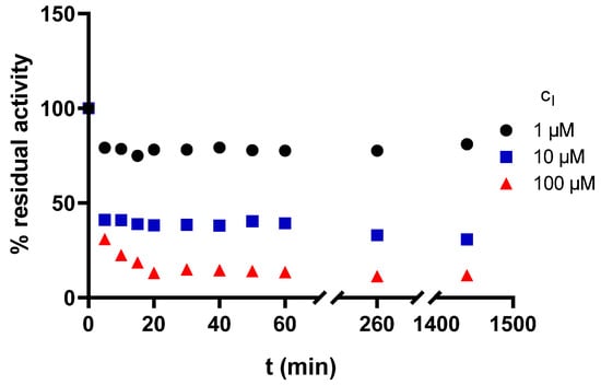 Three different concentrations were chosen for 3t according to its IC50 value for AChE. The first concentration was lower than IC50, the second was close to IC50 and the third was higher than IC50 (1, 10, and 100 µM, respectively). All obtained dependencies of A (expressed as residual activity on the Y-axis) versus time showed a very similar pattern (Figure 3). First, a rapid decrease in activity (for two lower concentrations, almost maximum inhibition is reached after 5 min), then a plateau phase followed by a recovery of enzyme activity over time.