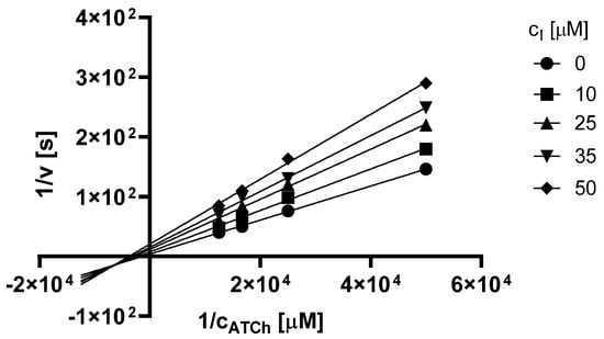 The Lineweaver–Burk plot obtained for 3t and AChE is shown in Figure 4. Based on the plot, it can be concluded that this heterocycle causes a mixed type of inhibition. The inhibition is associated with a change in both KM and Vm and also their ratio is different compared to the uninhibited reaction. In the Lineweaver–Burk plot, the intersection of the lines is in quadrant III but not on axis.