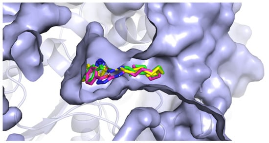 Crystallographic structures of human AChE and human BChE were obtained from protein data bank (www.rcsb.org accessed on 30 January 2022; pdb codes 4PQE and 1POI, respectively). The 3D structures of ligands were prepared in Chem3D Pro 19.1 (ChemBioOffice 2019 Package, CambridgeSoft, Cambridge, MA, USA). In the preparation process, water molecules were removed from the enzymes and the structures of enzymes and ligands were optimized using UCSF Chimera software package (Amber force field) []. Docking was performed using Autodock Vina [] and Autodock 4.2 []; a Lamarckian genetic algorithm was used. The 3D affinity grid box was designed to include the full active and peripheral site of AChE and BChE. The number of grid points in the X-, Y- and Z-axes was 20, 20 and 20, respectively, with grid points separated by 1 Å (Autodock Vina), and 40, 40 and 40, respectively, with grid points separated by 0.4 Å (Autodock 4). The graphic visualizations of the ligand-enzyme interactions were prepared in PyMOL (The PyMOL Molecular Graphics System, Version 1.5 Schrödinger, LLC, New York, NY, USA).