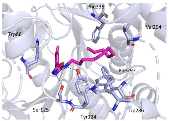 The active site of AChE was studied extensively in the past and is now very well described. It is known to be at the bottom of a very narrow gorge penetrating deep under the surface of the enzyme. All the prepared most active ligands (3b, 3c, 3t) displayed similar orientation in the cavity of AChE (Figure 5) which corresponds with the results of in vitro testing, since the obtained activities were all in relatively small range. Variable 5-aryloxadiazole moiety was heading for the bottom of the gorge (though still quite far from the active site triad). Hydrophobic 2-dodecylamino moiety was convoluted, pointing out of the cavity, and blocking the entrance to the gorge. Several hydrophobic interactions with Trp286, Val294, Phe297, and Phe338 were observed. Interestingly, an important structural element seems to be the -NH- group at the dodecylamino moiety, which is stabilized at its position by hydrogen bonds (Asp74 or Tyr124). The replacement of the nitrogen with carbon or sulfur leads to decrease in the binding affinity (and also decrease in the in vitro inhibition data). The oxadiazole part of the molecules showed hydrogen bonding with Ser125. Aromatic/heteroaromatic moieties were located at the anionic site and displayed π-π stacking with Trp86 (Figure 6).