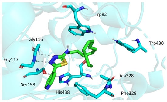 Similarly to AChE, the active site of BChE is located at the bottom of the gorge. However, a considerable number of aromatic residues present in active center of AChE is replaced by smaller hydrophobic residues in BChE. This allows more spacious ligands to enter the cavity. The top score docking pose of 3t (being the most potent inhibitor in the series) showed the molecule deep within the cavity in considerable proximity to active site Ser198 and His438 (Figure 7). The ligand was stabilized in its conformation by several interactions (namely, hydrogen bonds of oxadiazole moiety with Gly116 and Gly117 and hydrophobic interactions of dodecylamino moiety with Trp82, Ala328, Phe329, and Trp430). Most of the investigated compounds exhibited the same or quite similar conformation, apart from 3s. Its dodecylamino moiety was placed in the same hydrophobic part of the cavity; however, the aryloxadiazole moiety was relatively far from Ser198 and His438 and showed only one interaction with Thr120 (Figure 8). This could stand behind its low ability to inhibit BChE.