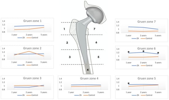 Nine patients in the ZA group and ten patients in the control group received a bone mineral density (BMD) assessment in the current study; similar baseline (pre-THA) and BMD values were observed in both groups. The mean BMD values were significantly higher for the ZA group in Gruen zone 6 at 1 year and in zones 1, 6, 7 at 2 years. The mean BMD values of the ZA group in all Gruen zones at 5 years were higher than the BMD values of the control group but to no statistical significance (Table 3). The BMD Change Ratios were significantly higher in the ZA group in Gruen zones 5 and 6 at 1 year, Gruen zone 6 at 2 years, and Gruen zone 6 at 5 years (Figure 2). In the ZA group, the BMD Change Ratios at 5 years in each Gruen zone showed a consistently positive value of greater than one, suggesting an increase from baseline, but to no statistical significance compared with the control group (Table 4).