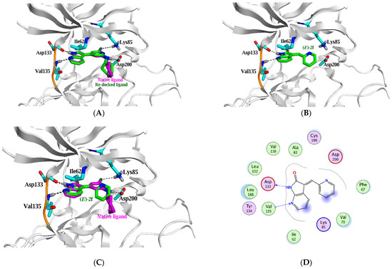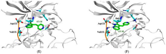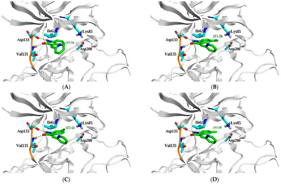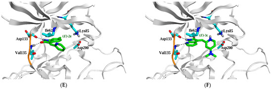 | (E)-2f | −6.0 (1.7) | 1.7 | N7 | H-donor | Asp 133 | 2.97 | −4.8 |