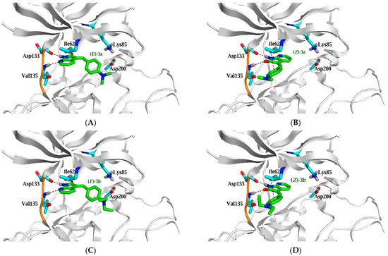 | (Z)-3b | −6.1 (1.8) | N1 | H-donor | Asp 133 | 3.45 | −1.6 | |