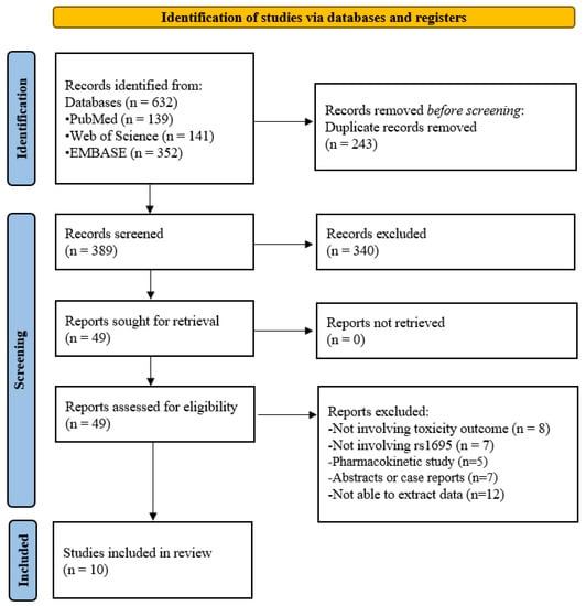 Figure 1 shows a flow diagram of the literature search and selection process. There were a total of 632 records initially searched from PubMed (n = 139), Web of Science (n = 141), and EMBASE (n = 352). After removing duplicates (n = 243) and irrelevant studies from the title and abstract (n = 340), 49 records were selected for full-text review. Thirty-nine records were excluded due to the following reasons: not involving toxicity outcome (n = 8), not involving rs1695 (n = 7), pharmacokinetic studies (n = 5), abstracts, or case reports (n = 7), or unable to extract data (n = 12). Therefore, this meta-analysis included ten studies [3,7,8,11,12,13,14,15,16,17].