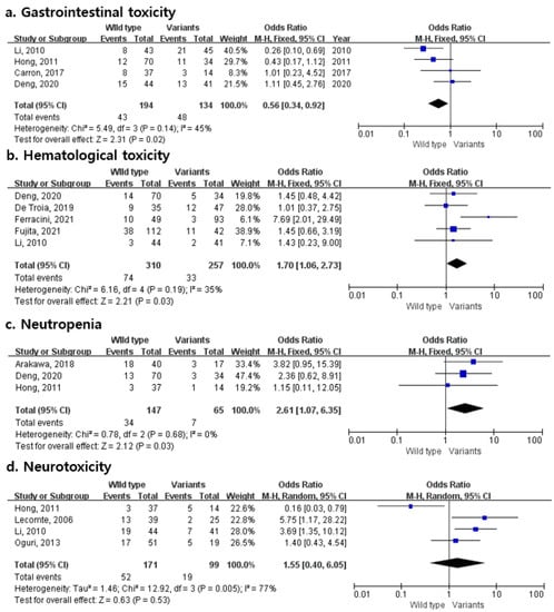 Figure 2. Forest plots of the association between platinum-induced toxicities and GSTP1 polymorphism (a) gastrointestinal toxicity; (b) hematological toxicity; (c) neutropenia; (d) neurotoxicity.