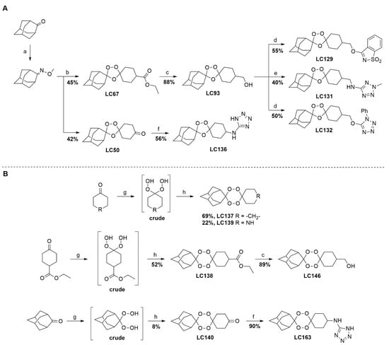 - Cabral, L.I.L.; Pomel, S.; Cojean, S.; Amado, P.S.M.; Loiseau, P.M.; Cristiano, M.L.S. Synthesis and Antileishmanial Activity of 1,2,4,5-Tetraoxanes against Leishmania donovani. Molecules 2020, 25, 465. [Google Scholar] [CrossRef] [Green Version]