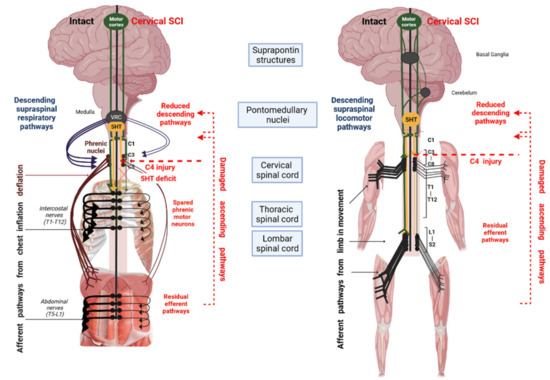 Spinal cord injury (SCI) affects more than 2.5 million people worldwide and is one of the most devastating conditions that an individual can sustain, leading to partial or complete loss of motor and sensory function below the injury level. Disruption of spinal cord integrity alters descending supraspinal pathways affecting motor drive, as well as ascending pathways affecting sensitivity. When injury is high, SCI results not only in motor impairment but also in marked respiratory dysfunction [1] due to alteration of the bulbo-spinal and cortico-spinal pathways. Furthermore, damage in descending and ascending pathways between brainstem/cortex and locomotor or respiratory neurons drastically reduces muscle efferents and afferents [2]. Indeed, central respiratory drive only occurs over physiologically active connections and not over less active or silent connections [3]. Hence, the damaged ascending pathways impair feedback to brainstem, cerebellum, and subcortical areas, resulting in dysregulation of the spinal network, impacting at both locomotor and respiratory levels.