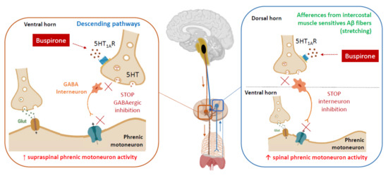 Expected mechanisms of action of Buspirone on respiratory network. Buspirone may directly increase the excitability of spared phrenic motoneurons by inhibiting an inhibitor interneuron in the ventral horn of the spinal cord. Alternatively, or in addition, it may enhance presynaptic transmission of proprioceptive sensory inputs from intercostal and abdominal muscles by inhibiting an inhibitor interneuron in the dorsal horn of the spinal cord [42,51,52].
