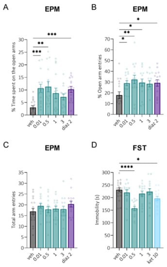 The anxiolytic and antidepressant-like activities of LCGA-17 were tested in the EPM and FST tests. In the EPM test, LCGA-17 and 2 mg/kg diazepam similarly increased the percent of time spent on the open arms of the maze (Figure 1A) and the percent of open arms entries (Figure 1B). LCGA-17-induced anxiolysis was pronounced at 0.5 mg/kg (p < 0.01) and 0.01 mg/kg (p < 0.05) based on both parameters. At 1 mg/kg, LCGA-17 only increased the percent of open arms entries (p = 0.03), and at a dose of 3 mg/kg, the effects of the peptide were absent (p > 0.07). Neither LCGA-17 nor diazepam affected the total arm entries (p > 0.49), indicating the absence of locomotor effects in this test (Figure 1C). Together, these results suggested that LCGA-17 had rapid anxiolytic-like properties after i.n. administration, which was more prominent at the 0.01–0.5 mg/kg dose range. The peptide effects were similar to diazepam at 0.01–0.5 mg/kg, yet without any sedative effects.