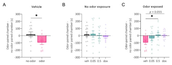 Figure 2A shows no odor and odor-exposed groups treated with the vehicle. Predator odor exposure produced a significant conditioned place aversion at 24 h post-exposure (p = 0.01). The treatment groups did not differ when the rats were not exposed to a predator odor (Figure 2B). Administration of 0.5 mg/kg (p = 0.02), but not 0.05 mg/kg, LCGA-17 significantly attenuated odor-induced place aversion, as observed in the vehicle-treated animals (Figure 2C). Doxazosin (dox, 1 mg/kg) showed efficacy at reducing odor-paired chamber avoidance but only at a trend level (p = 0.06, Figure 2C).