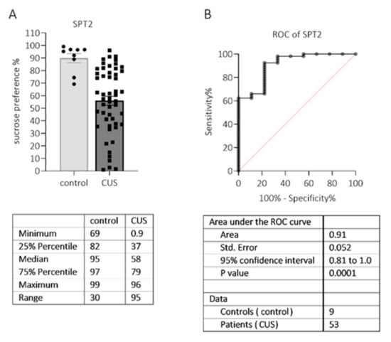 The results of the sucrose preference test (SPT2) after CUS procedures in rats. Control animals (n = 9) were living under standard vivarium conditions, while stress-exposed animals (CUS, n = 56) were housed individually and exposed to unpredictable stressors (two a day) for 26 days; (A) The sucrose preference was significantly reduced in stressed animals (M-W U = 44.0, p < 0.0001); (B) The ROC curve characteristics showed a high predictive value for a sucrose preference as a marker of stress (AUC value = 0.91).