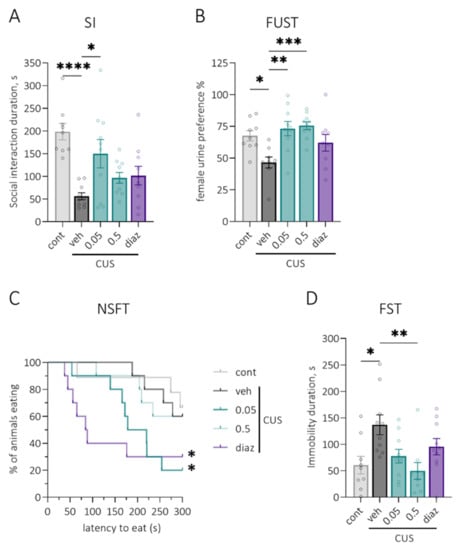 Anxiolytic- and antidepressant-like efficacy of LCGA-17 in the CUS model. Animals were exposed to chronic stress for 26 days, and control rats remained intact. Separate groups of rats (n = 9) were treated with i.n. LCGA-17 (0.05 and 0.5 mg/kg) or diazepam (0.5 mg/kg, i.p.) or the vehicle for several days, followed by behavioral analyses. On the day of the experiment, substances were administered 30 min before the test. (A) In the SI test, the duration of social contact (s) was significantly decreased in vehicle-treated CUS-exposed rats, while LCGA-17 0.05 mg/kg (4 injections) significantly increased this parameter (H (5, 45) = 19.88, p = 0.0005; K–W, Dunn’s test); (B) In the FUST, CUS exposure led to a decreased preference for female urine (%); at the same time, LCGA-17 at both doses (8 injections) abolished the effect of stress on reward-seeking behavior (F (4, 40) = 5.62, p = 0.001; ANOVA, Dunnett’s test); (C) In the NSFT, latency to eat was not affected by stress, though 0.05 mg/kg LCGA-17 and diazepam administered for 11 days both decreased this parameter (chi-square = 11.67, p = 0.02; Log-rank Mantel–Cox test); (D) In the FST, stressed vehicle-treated rats spent more time immobile (s), while LCGA-17 (18 injections) dose-dependently decreased the immobility in this test (H (5, 45) = 14.99, p = 0.005; K–W, Dunn’s test). * p < 0.05, ** p < 0.01, *** p < 0.001, and **** p < 0.0001 vs. veh group.