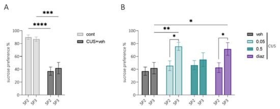 The EPM was used to assess anxiolytic-like drug activity. For the EPM [], the percentage of time spent in the open arms, the percentage of open arm entries, and the number of total arm entries during a 5 min session were recorded. The FST assessed antidepressant-like drug activity, as described by Reference []. Briefly, on day one, the rats were exposed to a 15 min pre-swim in a cylinder filled with 25 ± 1 °C water. They were re-exposed to the same apparatus for a 5 min test session, with the behavior video recorded the next day. Animal behavior for the EPM and FST were recorded and analyzed with specialized software (Ethovision XT12, VA, USA). The SPT was performed as described previously []. Briefly, rats were given for 48 h a free choice between two bottles, one with a 1% sucrose solution and another with tap water. The SPT was carried out three times: first (SPT1), at the baseline prior to any manipulations; second (SPT2), to assess the effect of CUS exposure; and third (SPT3), as part of the behavioral battery of tests. Sucrose consumption in animals was assumed as a measure of anhedonia, a core symptom of major depression according to DSM-5 []. The preference index was calculated using the formula: