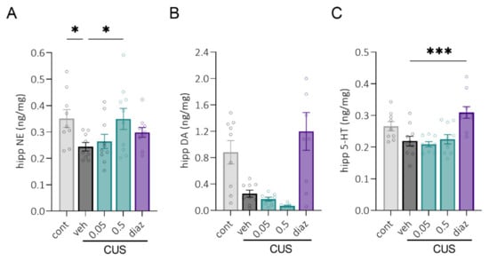 Chronic LCGA-17 effects on the bioamines levels after CUS. Separate groups were treated for 22 days before sacrifice with either LCGA-17 (0.05 and 0.5 mg/kg i.n.) or diazepam (0.5 mg/kg i.p.). (A) The norepinephrine level was significantly reduced in the hipp of stressed rats compared to the control animals. LCGA-17 in a dose of 0.5 mg/kg increased the NE levels in the hippocampus to the control levels (F (4, 40) = 2.79, p = 0.038; ANOVA, Dunnett’s test); (B) None of the treatments showed a significant change in hipp DA concentrations (H (5, 42) = 21.97, p = 0.0002; K–W, Dunn’s test); (C) Diaz increased the 5-HT levels in the hipp of stressed rats (F (4, 40) = 8.1, p < 0.0001; ANOVA, Dunnett’s test). * p < 0.05 and *** p < 0.001 vs. the veh group.